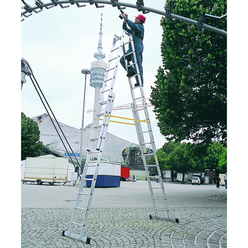 Treppengängige Mehrzweckleiter mit Ausziehfunktion für sicheren Stand in großen Höhen. Ideal für Arbeiten auf Treppen, in Sporthallen, Sälen usw. Bequem und präzise von Sprosse zu Sprosse im Raster von 280 mm höhenverstellbar. Sichere Arretierung durch Haken mit Abhebesicherung.